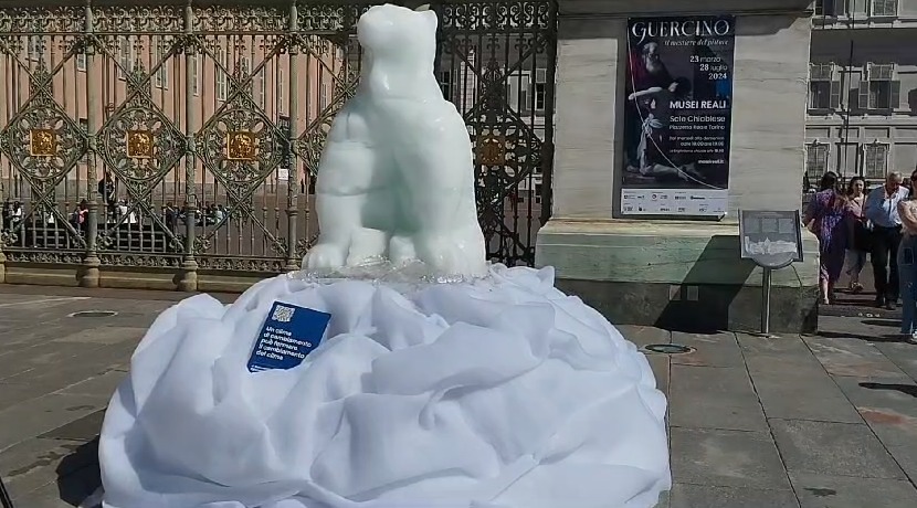 Un gigantesco orso polare fatto di ghiaccio è comparso questa mattina in Piazza Castello, proprio davanti ai cancelli di Palazzo Reale.